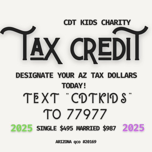 As a qualifying charitable organization, CDT Kids is able to take advantage of the AZ tax credit program. The Arizona State Tax Credit program allows you to make a donation to an eligible organization and receive a dollar-for-dollar credit against Arizona state taxes owed. Arizona Tax Credits allow the taxpayer to choose where a portion of their state income taxes will go. It’s all about having the choice and contributing to an organization or cause that is meaningful.